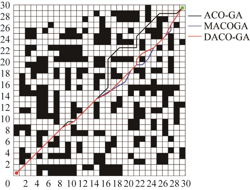 | 图18 基于ACO-GA、MACOGA和DACO-GA的最优路径对比 |