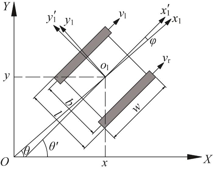 基于上述假设,对泳池清洁机器人的运动情况进行分析。为描述机器人在平面内的运动状态,以泳池底部平面上的某一固定点为原点构建参考坐标系O -XY ,如图1 所示。当机器人位于泳池底部平面上某一点时,其位姿可用位置(x , y )和航向角θ 表示;机器人的速度由左右侧履带的速度控制,设左、右侧履带沿机器人前进方向的线速度分别为v l 、v r 。令机器人的长度为l 、宽度为w ,左右侧履带的中心距为b ,以机器人质心为原点构建运动坐标系o 1 -x 1 y 1 ,其中x 1 轴的正方向为机器人的前进方向。