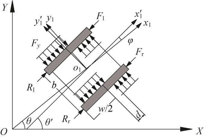 随后,考虑机器人的履带与泳池底部接触时存在侧滑的情况,令侧滑角为φ 。在参考坐标系中,机器人的速度可表示为v = [ v x v y ] Τ ,其中vx 、vy 分别为机器人速度沿x 1 、y 1 轴方向的速度分量;机器人的侧滑角φ = a r c t a n v y / v x 。在存在侧滑的情况下,机器人速度的分量vx 、vy 及转向角速度θ ˙ 可表示为: