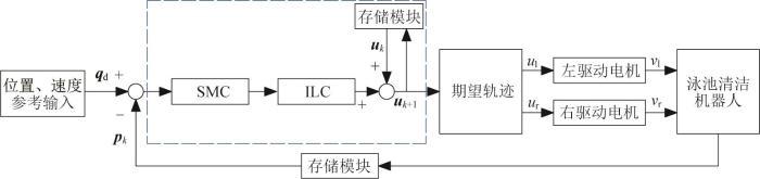 对于泳池清洁机器人的轨迹跟踪控制,早期研究大多采用PID(proportional-integral-derivative,比例-积分-微分)控制策略。PID控制结构简单且参数整定方便,在外部扰动较小的场景下可实现精确控制。然而,当系统受到大量动态变化、非线性因素影响时,传统PID控制难以保证控制精度与系统鲁棒性。而泳池清洁机器人在实际作业过程中的运动轨迹具有显著的重复性特征,且伴有随机扰动与滑移偏差。在此类工况下,仅依赖单次反馈调节的PID控制难以实现机器人的高精度轨迹跟踪。为解决上述问题,一些学者引入了迭代学习控制(iterative learning control, ILC)[5 ] 。ILC可在多次任务执行过程中利用上一轮任务的跟踪误差对控制输入进行补偿修正,使系统的控制性能随迭代逐步改善,从而有效弥补传统PID控制在重复轨迹跟踪任务中的不足。目前,ILC控制律包括D型、P型、PD型等多种[6 -10 ] 。尽管ILC在重复运动控制中具有显著优势,但其仍面临对初始条件较为敏感、对未知外部扰动和模型不确定性抑制能力有限等问题。基于此,陶洪峰等[11 ] 提出了一种基于ILC的离散非线性系统轨迹跟踪鲁棒优化算法;Meng等[12 ] 针对非重复不确定系统的鲁棒ILC策略进行了深入研究。为进一步增强ILC在复杂非线性系统中的鲁棒性,部分学者将ILC与滑模控制(sliding mode control, SMC)相结合[13 -17 ] 。SMC是一种典型的非线性控制方法[18 -19 ] ,通过构造滑模面并设计不连续的控制律,使得系统状态在有限时间内收敛至滑模面附近并沿其运动,从而有效抑制外部扰动和参数不确定性的影响。Goswami等[20 ] 提出了一种基于SMC的移动机器人轨迹跟踪控制方法,验证了SMC在复杂工况下的有效性。