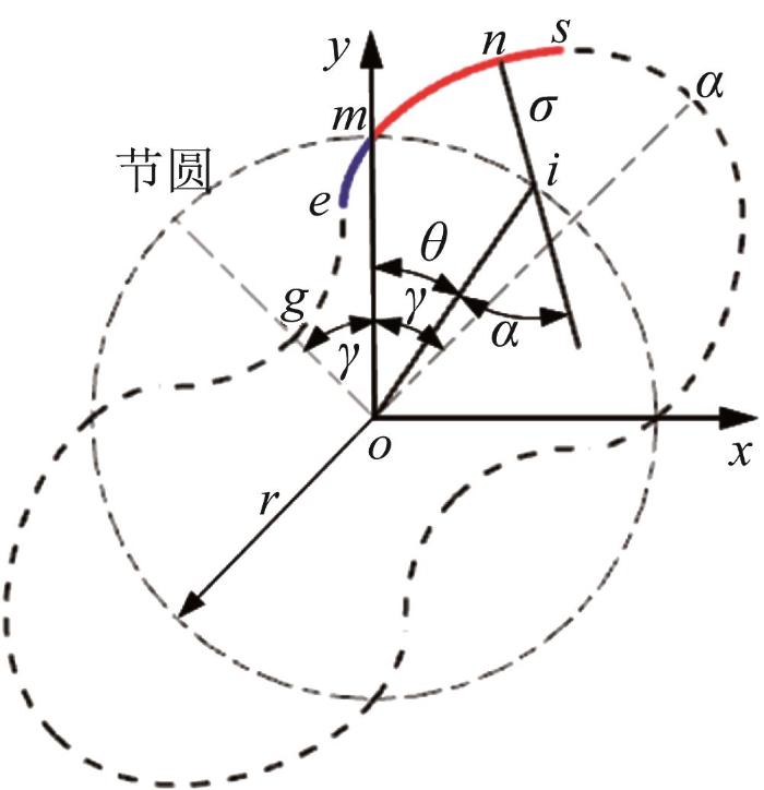 在图1 所示的坐标系xoy 下,由啮合点n (x , y )的参数化坐标,可得啮合轮廓方程: