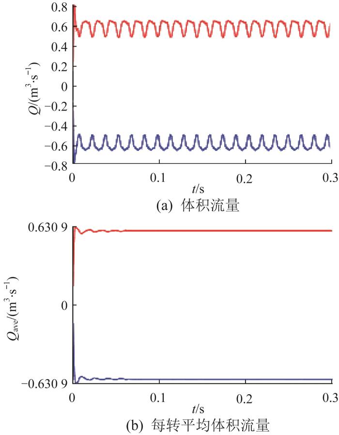 在进出口零压差(无内泄漏)的前提下,项目I中进口边界面的体积流量和每转平均体积流量的仿真结果如图6 所示,仿真值与理论值的相对误差如表5 所示。