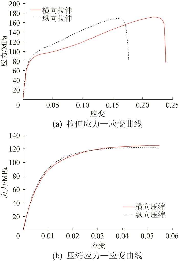 某在产车型原前防撞装置的防撞横梁、吸能盒和底板的材料均为6082-T6铝合金。本文所选用的单向玄武岩纤维布由四川炬原玄武岩纤维科技有限公司提供,单层厚0.17 mm、宽400 mm。采用手糊成型工艺,将玄武岩纤维布以纵横交替的方式铺层,并使用上海惠柏材料有限公司提供的LT-5028AB环氧树脂[12 ] 作为基体材料,制成尺寸为400 mm×400 mm的BFRP层合板。对角线切割层合板,制作5组±45°铺层的试验样件。随后,依据GB/T 3354—2014《定向纤维增强聚合物基复合材料拉伸性能试验方法》,在三思纵横电子万能试验机上对样件进行拉伸与压缩试验,以获得弹性模量、压缩模量等性能参数。试验样件与测试装置如图1 所示,其中1#试验样件的拉伸/压缩应力—应变曲线如图2 所示。将试验获得的相关数据导入LS-DYNA软件,用于定义防撞装置有限元模型中BFRP的材料属性。BFRP与铝合金的材料属性如表1 所示。