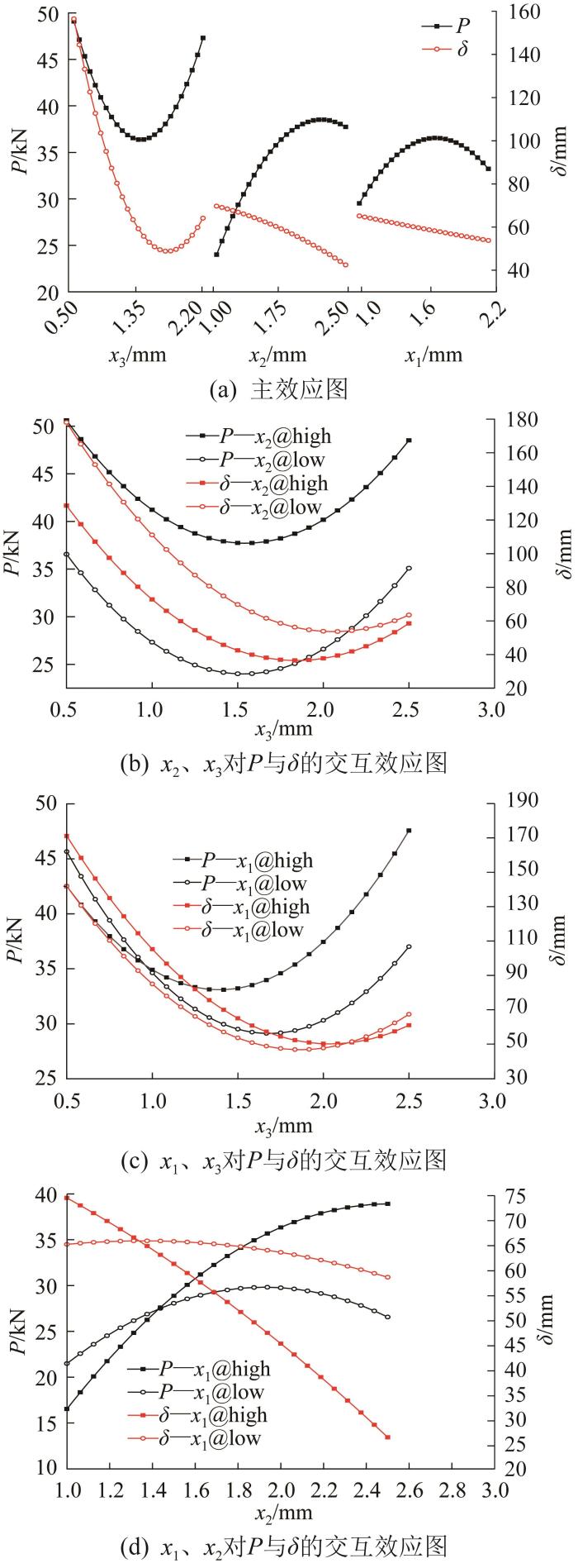 敏感度分析是一种评估设计变量变化对响应指标影响程度的方法,其在结构设计与优化、可靠性分析等多个领域得到了广泛应用[14 ] 。根据表2 所示的求解结果,利用Isight软件对设计变量进行敏感度分析,结果如图4 所示(图中@high、@low分别表示设计变量取设定的上限值和下限值)。由图4 (a)可知,随着3个设计变量的变化,峰值载荷P 均表现出显著的二次非线性效应。其中:P 随BFRP铺层厚度x 3 的增大总体呈先降后升的趋势;P 随吸能盒厚度x 1 和防撞横梁铝合金厚度x 2 的增大呈先升后降的趋势,即x 1 、x 2 的影响与x 3 相反。横梁最大位移δ 仅对x 3 表现出显著的二次非线性效应,δ 与x 1 和x 2 均呈负相关。由图4 (b)~(d)可知,设计变量x 1 、x 2 、x 3 对P 与δ 存在显著的交互作用。另外,由经验可知,随着3个设计变量的不断增大,防撞装置的总质量必然增大且并无交互效应,故未给出相关图形。