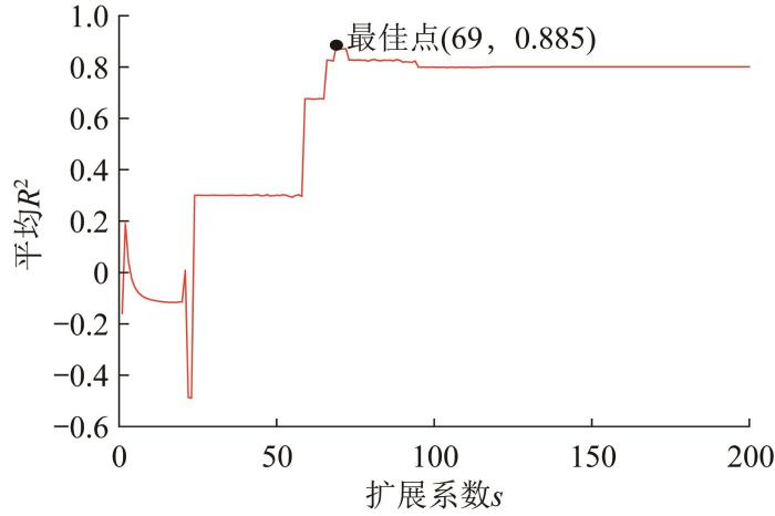 代理模型可建立实际复杂问题的高精度替代数学模型,减少优化迭代过程中数值模拟的计算时间,有效提高优化效率[15 ] 。其中,RBF(radial basis function,径向基函数)神经网络具有训练速度快、结构简洁和泛化能力强等优势,在函数逼近、数据插值及工程优化等领域得到了广泛应用[16 ] 。基于此,以表2 中的30组样本作为训练集,以额外生成的10组样本作为测试集,构建RBF神经网络代理模型。首先,将所有样本导入MATLAB软件进行归一化处理,调用神经网络工具箱中的newrbe函数,以设计变量为输入、响应指标为输出建立RBF神经网络代理模型。随后,在测试集上验证代理模型的性能,通过优化扩展系数s ,使模型性能达到最佳。扩展系数的优化曲线和最佳点如图6 所示(以决定系数R 2 表征模型的拟合优度)。最后,计算代理模型的平均偏差(mean bias error, MBE)、平均绝对误差(mean absolute error, MAE)、均方根误差(root mean squared error, RMSE)和决定系数R 2 等评价指标,结果如表3 所示。