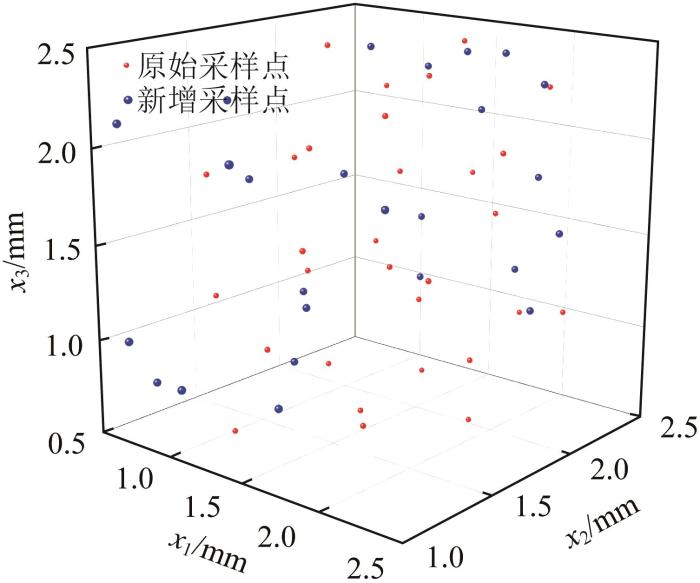 由表3 可知,峰值载荷、横梁最大位移的相应误差评价指标均超出正常范围,仅质量指标满足要求。为适度提高代理模型的预测精度,在设计空间内利用优化的拉丁超立方抽样法进行补充采样,新增100个采样点,并分别计算其与30个初始采样点之间的加权欧式距离,计算式如下: