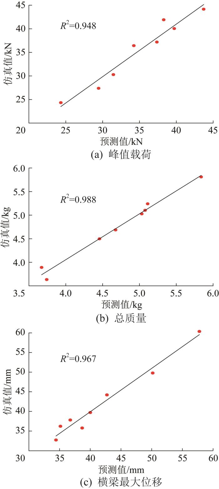 通过基于加权欧式距离的空间填充采样后[17 ] ,将55个样本点导入MATLAB软件进行归一化处理并重新建立代理模型,对其进行误差分析,结果如表6 所示。从表6 中可以看出,新建立的各代理模型的决定系数均大于0.9,表明模型是可信的。进一步对新建立的代理模型的拟合精度进行检验,结果如图8 所示。由图8 可知,各响应指标的预测值与仿真值基本吻合,说明所构建的代理模型具有较高的预测精度,可用于后续的优化分析[18 ] 。