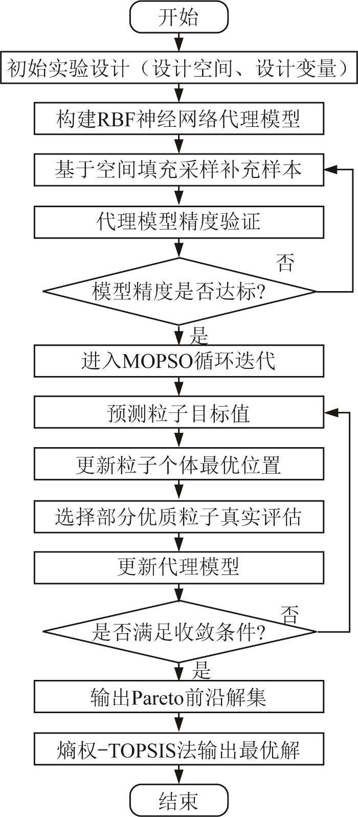 ... MOPSO算法通过模拟鸟群、鱼群的群体协作行为,在相互冲突的目标函数间搜索Pareto最优解集[19 ] .相较于遗传算法,MOPSO算法的优势在于局部搜索能力更强、收敛速度更快.利用MATLAB软件搭建MOPSO-RBF神经网络混合优化框架,动态更新代理模型.该混合优化方法在求解高计算成本、产品迭代更新等工程问题时表现出显著优势.基于MOPSO的多目标优化流程如图9 所示.本次优化将粒子群规模设为50,经200次迭代后得到2 018组可行解,其中178组Pareto前沿解如图10 所示. ...