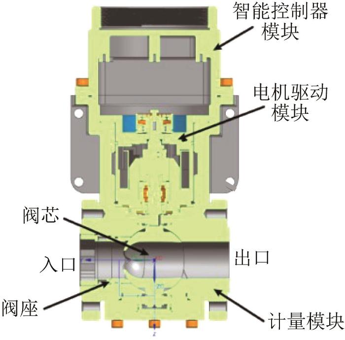 燃气调节阀是一种集成机载电子位置控制器的电动气体计量阀,其核心功能模块主要包括计量模块(DN50球阀)、电机驱动模块及智能控制器模块,如图1 所示。电机驱动模块作为燃气调节阀的动力输出单元,其输出轴与计量模块的V形阀芯直接相连,电机旋转时带动V形阀芯转动,V形阀芯的旋转角度直接影响天然气的输送流量;同时,智能控制器模块的旋变装置将V形球阀的实际旋转角度回传至控制系统,形成闭环控制,以确保燃气调节阀的控制精度。