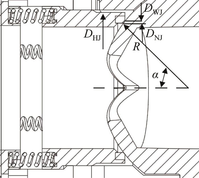 式中:f 为阀座与阀芯之间的摩擦系数,r 为摩擦半径,Q 为阀芯表面所受的作用力,Q M 为阀座承受的介质作用力,Q Y 为弹簧预紧力,p 为介质压力,D HJ 为阀座外径,D NJ 为阀座密封面内径,D WJ 为阀座密封面外径,q min 为弹簧预紧所需的最小比压,R 为阀芯半径,α 为阀座和阀芯密封处与通道中心线之间的夹角。