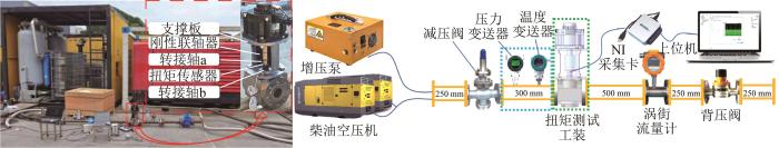 为同时测试不同介质压力下燃气调节阀的扭矩及流量特性,在扭矩测试工装的基础上进一步完善试验台,如图8 所示。试验设备包括增压泵(小流量)、大型柴油空压机(大流量)、扭矩测试工装、压力变送器、减压阀、背压阀(或手动球阀)、涡街流量计。其中:增压泵可产生的最大压力为30 MPa,满足最高测试压力为5.2 MPa的工况;压力变送器的最大量程为0~10 MPa,精度为0.01%FS(full scale,满量程),其输出信号为4~20 mA的模拟信号。大型柴油空压机能够提供较大流量,其单台功率可达246 kW,最大吸气量为22.1 m3 /min,最大压力为2.07 MPa;减压阀的最大进口压力为2.5 MPa;背压阀的公称直径为50 mm,调节压力范围为0~2 MPa,满足流量条件。