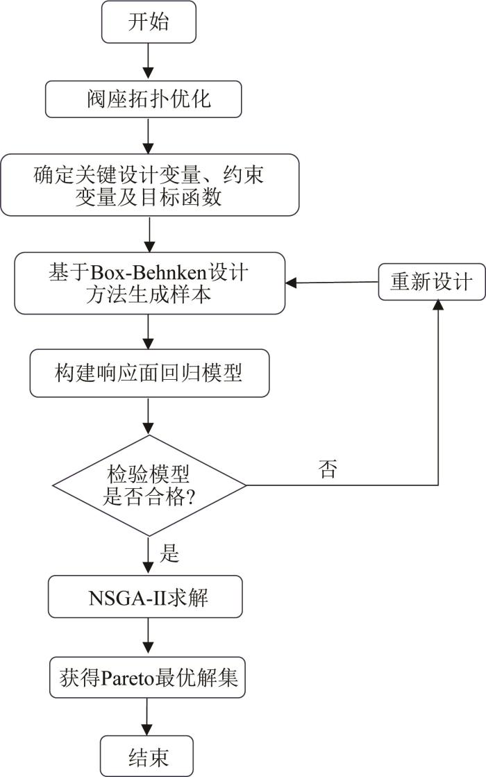 首先,利用拓扑优化法对燃气调节阀的阀座结构进行优化,以降低介质压力对启闭扭矩的影响。随后,采用响应面法与NSGA-Ⅱ相结合的方法,对影响燃气调节阀启闭扭矩的关键参数进行优化。燃气调节阀低扭矩优化流程如图 9 所示。