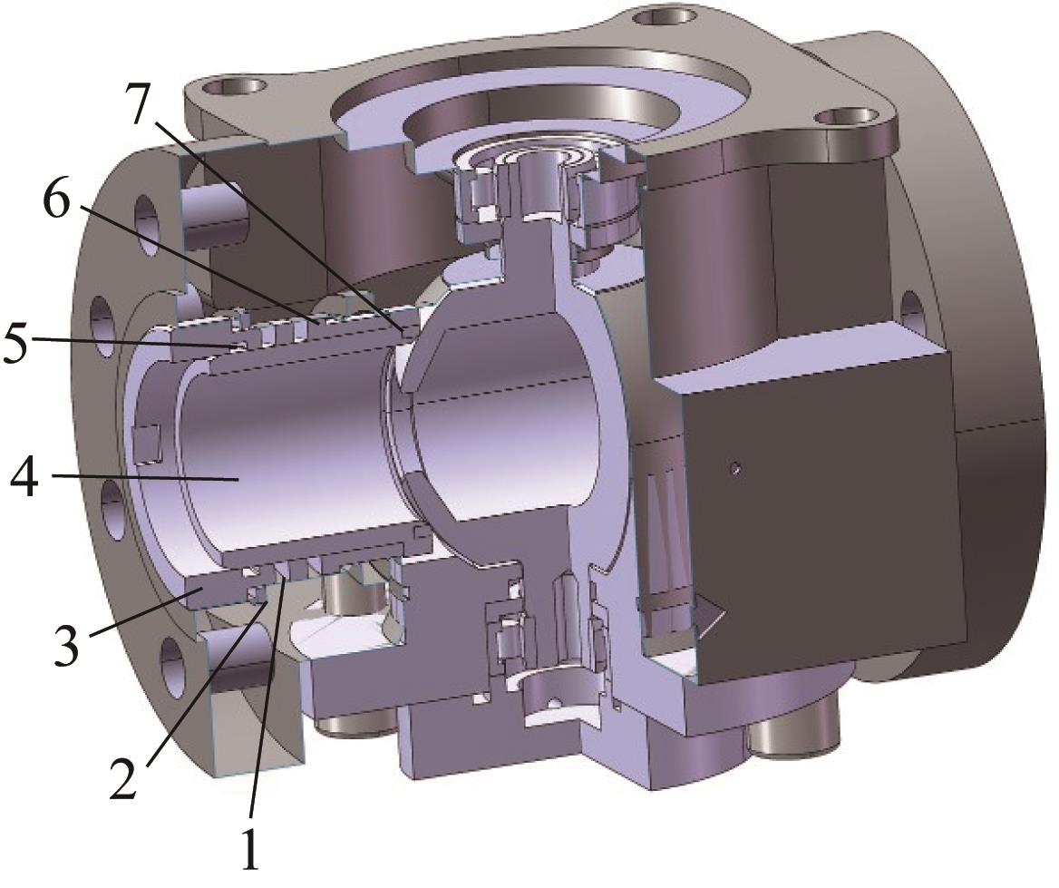 | 图16 优化后的阀座结构1—波形弹簧;2—密封圈Ⅰ;3—压紧座;4—阀座;5—O形圈;6—轴套;7—密封圈Ⅱ。 |