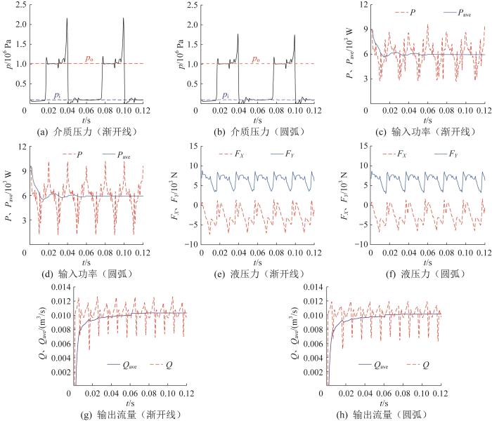 1)非全工作型轮廓转子(如渐开线转子):封闭腔室由过渡圆弧形成扇形圆环通道,该通道的流通面积小且阻力大,不利于腔室内介质在压缩/膨胀过程中及时排出或补充,导致压力脉动剧烈,最大压力较出口压力的增幅为113.3%。