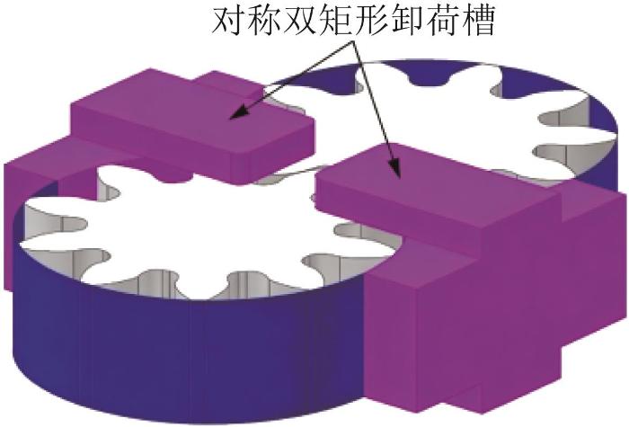 鉴于罗茨泵与齿轮泵在结构原理和困油机理上的一致性,本文借鉴齿轮泵的困油卸荷设计思路:通过在端盖内侧表面开设凹槽,来削弱因齿轮副重合度大于1(满足传动需求)所引发的困油腔容积周期性变化问题。图5所示为某款采用对称双矩形卸荷槽结构的齿轮泵几何模型。