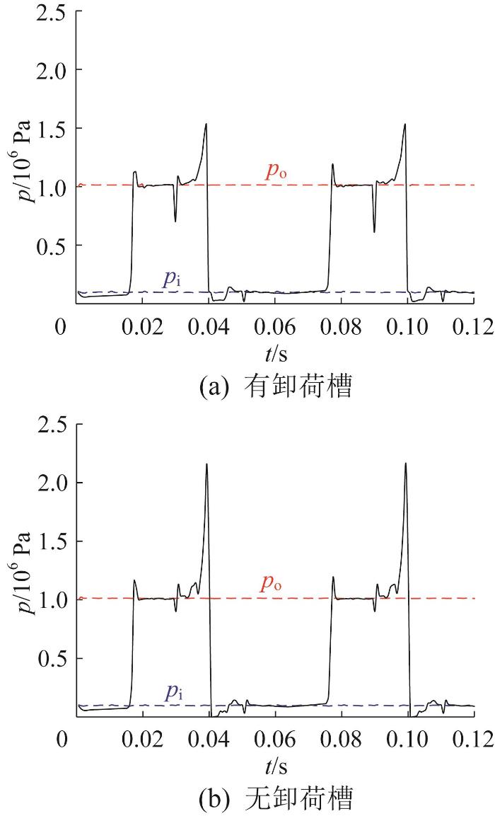 有/无卸荷槽渐开线罗茨泵的介质压力曲线