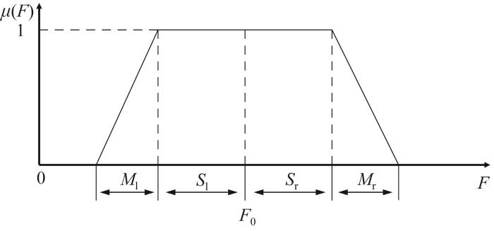 因危险源所导致的起重机失效程度存在不确定性,采用模糊数对失效程度进行描述。通常将失效程度描述为[0, 1]内的模糊数,其中:0表示正常,0.5表示为中度失效,1表示为高度失效。为了使用方便且不失一般性,本文选用梯形隶属函数,如图4所示。