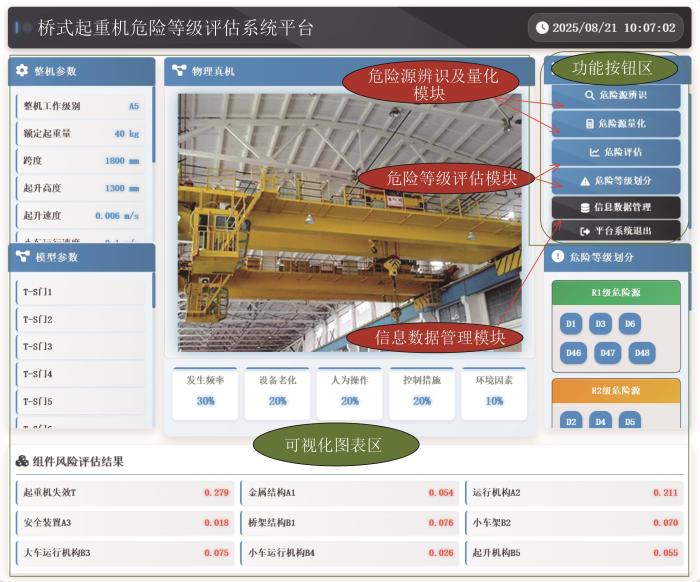 2)开发了专用型桥式起重机危险等级评估系统平台,实现了评估流程的智能化革新,将传统依赖人工手动编码的建模分析模式转化为直观便捷的可视化交互操作模式。通过内置的算法与标准化模板,系统平台能够自动生成专业规范的评估报告,有效地消除了传统评估流程中因人为操作差异而导致的评估偏差,显著提升了桥式起重机危险等级评估的标准化水平,大幅缩短了评估周期。