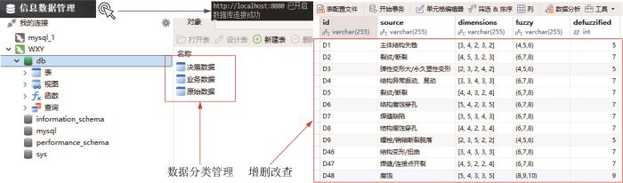 点击“信息数据管理”按钮,系统平台连接数据库,成功读取并显示数据。此外,在危险源辨识及量化过程中产生的业务数据反馈至危险等级评估模块,并推送至系统平台界面进行显示。同时,所有数据传回数据库分类存储管理,以实现数据增/删/改/查等操作,如图12所示。