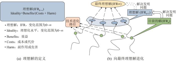 成功的企业能持续为用户创造更高的价值。该类企业的特点是所开发产品的理想化水平不断提升,即理想解(ideal final result, IFR)不断向最终理想解(IFR ∞, IFR∞)进化[3]。理想解及其进化如图1所示。图1(a)中,Ideality为理想化水平,是对理想解的度量,产品进化的极限状态是其为无穷大,即Ideality=∞,此时IFR为IFR∞。这种状态的物理意义是产品的效益或功能无穷大、成本与副作用之和为常量,或效益或功能为常量、成本与副作用之和为无穷小。图1(b)中,理想解IFR n+1的理想化水平大于目前解IFR n 的理想化水平,即理想解对应的产品优于目前的产品。按照技术进化规律,产品创新均向IFR∞方向进化,进化的极限为IFR∞。
