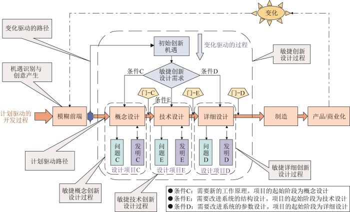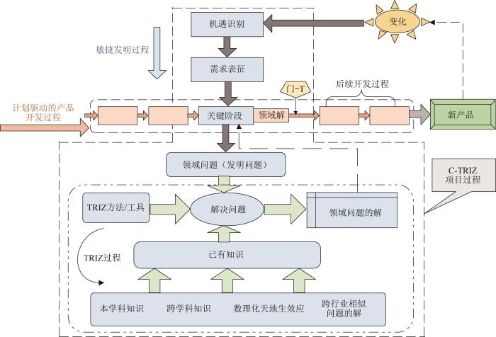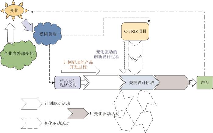 由于变化已成常态,企业创新是计划与变化融合的混合驱动创新过程,如图7所示。计划驱动使企业关注大且长期的目标,即最终产品及其主要功能的实现,同时关注反映原始需求的可生产产品,确定满足其预期使命的最终产品。变化驱动(敏捷创新)则划分为一系列短时间的冲刺,其流程不是基于计划,而是为响应变化所形成的一系列冲刺,敏捷设计是一种“设计当前所需要的”概念。2种驱动对应2种创新过程,即计划驱动的产品开发过程和变化驱动的创新设计过程,2个过程通过关键设计阶段耦合。学术界的理论研究与企业的产品开发实践经过多年交互,不仅已构建了计划驱动的产品开发过程模型,而且其应用效果得到了证实,如Pahl等[35]提出的设计过程模型就是被广泛应用的模型。变化驱动的创新过程研究是近年来才提出的研究方向,还未形成能被广泛接受的过程模型。C-TRIZ及其扩展[11-13]为该方向的研究提出了一种新模式。