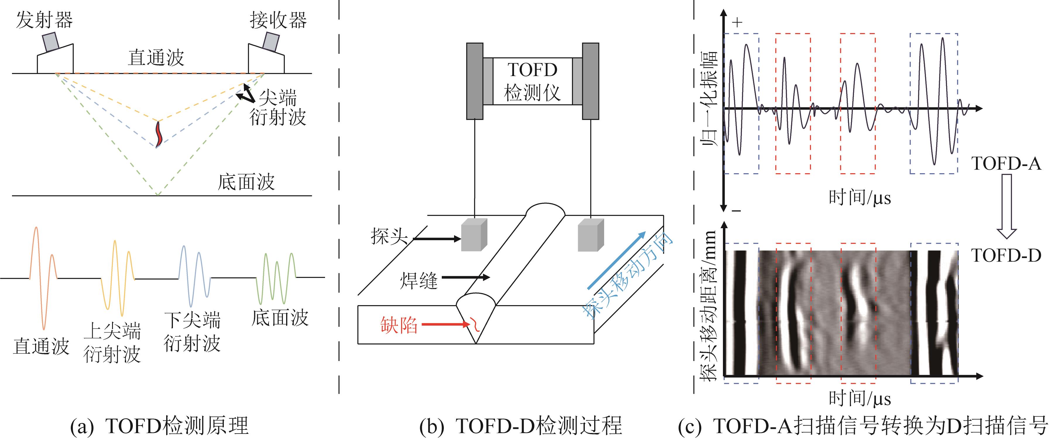 | 图2 TOFD检测原理与成像过程 |