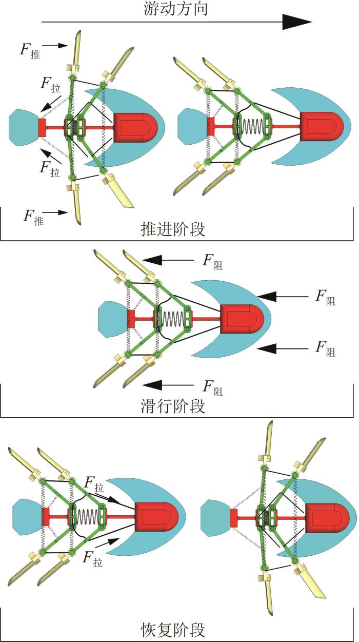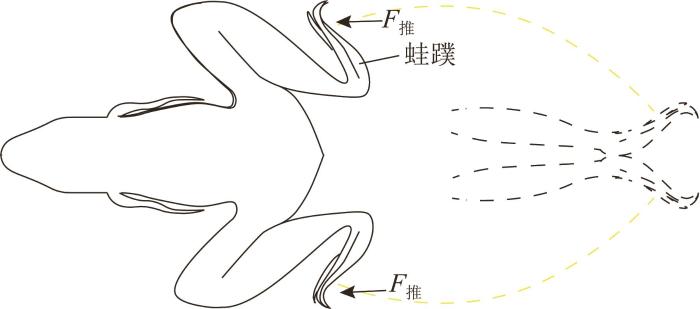 如图1所示,青蛙在游动时,大腿后摆,下肢快速伸展,以完成蹬水动作。在该过程中,蛙蹼瞬时沿曲线轨迹划动,通过与水的相互作用产生推进力,使得青蛙能够在毫秒级时间尺度内产生显著的加速度。