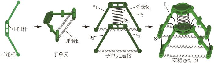 双稳态致动器采用模块化设计,其核心单元为聚乳酸(polylactic acid, PLA)材质的三连杆铰接组件,如图6所示。其中,中间杆件通过梯形截面对旋转副的转动角度实施硬限位。三连杆铰接组件的自由端通过预拉伸的弹簧k1连接构成子单元,2个子单元通过弹簧k2整体连接。2根短线缆S(直径为1 mm)的两端分别固定在杆a1与a2和c1与c2的自由端;2根长线缆L(直径为1 mm)的中点分别固定在杆b2中点的前后两侧,两端均固定在杆a1和c1的中点处。