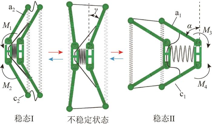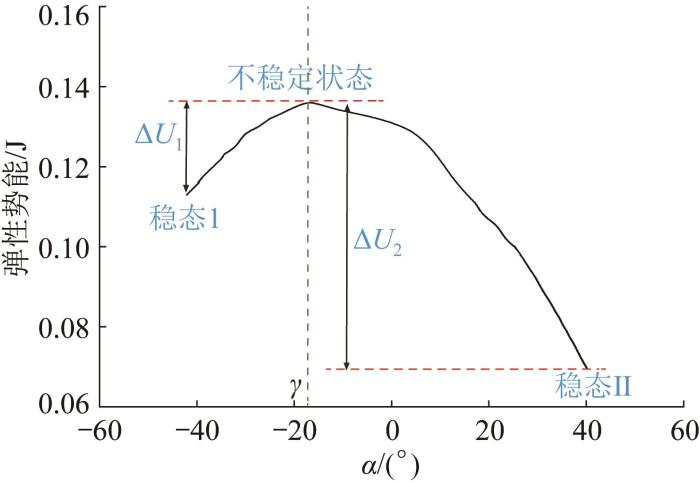 由于弹簧预紧力的作用,双稳态致动器只有2种稳定状态(稳态Ⅰ和稳态II),如图7所示。图中:α为杆a1与中间杆的夹角(即桨叶摆角),取逆时针方向为正,当α=γ(γ为失稳临界摆角)时,该结构的整体弹性势能达到最大。在稳态Ⅰ下,对杆a2和c2施加大小相等、方向相反的力矩M1和M2,此时连杆弯曲,弹簧k1开始伸长并储存弹性势能。当持续施加的力矩所做的功突破能量势垒后,该结构会经过不稳定状态(α=γ)。根据能量最小化原理,在经过不稳定状态并撤销所施加的力矩后,双稳态致动器会自发地在几十毫秒内进入稳态II,此时弹簧k1和弹簧k2均发生弹性形变并释放大量弹性势能,从而实现稳态切换间的大功率输出。