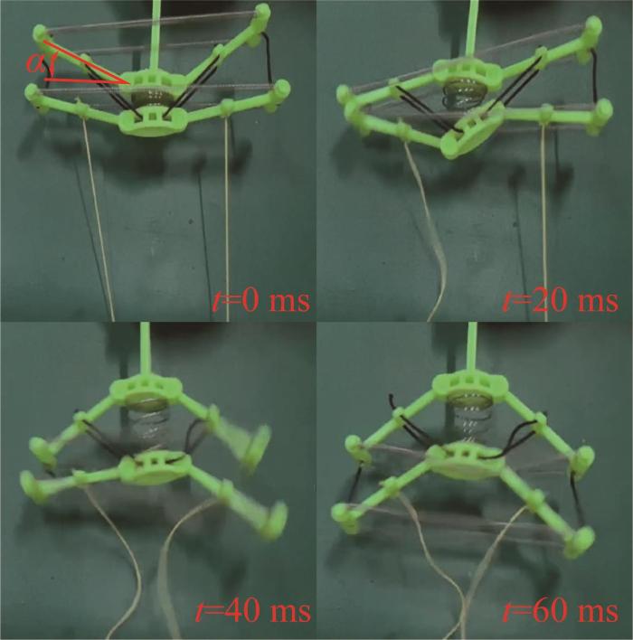 为了验证双稳态致动器从不稳定状态进入稳态II只需几十毫秒,开展样机实验。如图10所示,将双稳态致动器的一端固定,通过2根细线以相同的速度缓慢拉扯杆a2和c2,以触发稳态切换。实验结果显示:当t=0 ms时,α≈γ,致动器处于亚稳态临界点;当t=20 ms,杆件发生非对称摆动,由于整体结构不完全对称,左侧杆件先剧烈摆动;当t=40 ms时,杆a1、c1、a2、c2均剧烈摆动;当t=60 ms时,致动器完成稳态切换过程。