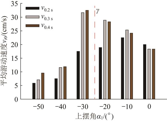 为确定桨叶摆角幅值对机器人响应能力的影响,如图12所示,通过实验分析不同桨叶上摆角α1下机器人样机在静止启动后0.2、0.3、0.4 s内向前游动的平均速度v0.2 s、v0.3 s和v0.4 s。其中:γ≈-23.4°,下摆角α2=30°。