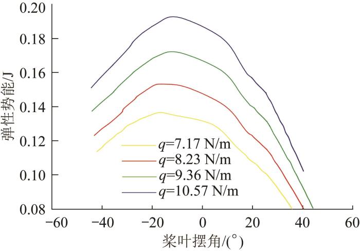 为了确定主弹簧k1的刚度对双稳态致动器整体弹性势能和临界摆角γ的影响,利用ADAMS软件对不同主弹簧刚度q(q=7.17, 8.23, 9.36, 10.57 N/m)下双稳态致动器的稳态切换过程进行动力学仿真,结果如图15所示。从图15中可以看出,不同弹簧刚度下,双稳态致动器弹性势能的储存/释放量存在明显差别,当q=10.57, 9.36, 8.23, 7.17 N/m时,弹性势能的最大值分别为0.192、0.171、0.153、0.136 J;当桨叶摆角α=30°时,不同弹簧刚度下的弹性势能分别为0.135、0.119、0.105、0.091 J,则对应的弹性势能释放量ΔU2分别为0.057、0.052、0.048、0.045 J。由此可知,ΔU2随主弹簧刚度的降低而减小,即增大主弹簧k1的刚度可使双稳态致动器在稳态切换阶段释放的弹性势能ΔU2增大。而临界摆角γ随主弹簧刚度的变化不明显,在不同弹簧刚度下均在-20°~-10°之间。