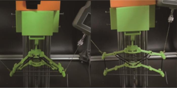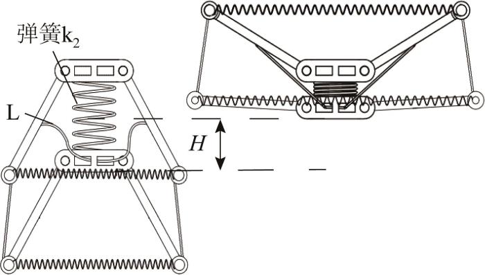基于此,本文将双稳态结构引入仿青蛙游动机器人的推进系统,提出了一种基于连杆-弹簧-线缆复合机构的双稳态致动器。该装置由预拉伸弹簧、刚性连杆及高模量线缆组成,通过弹簧势能周期性地储存与释放,实现2个稳态之间的快速切换。通过双稳态致动器独特的能量快速释放特性,可实现仿青蛙游动机器人的快速响应能力。