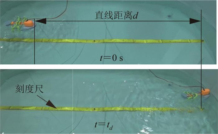 对单个运动周期内机器人样机在不同桨叶摆角下的响应性能进行实验测试,得到了桨叶摆角幅值对机器人响应能力的影响。同时,对双稳态致动器的储能/释能量及其摆动输出力进行了ADAMS动力学仿真分析和样机实验测试,得出提高主弹簧k1的刚度可以提升双稳态致动器的储能/释能量和摆动输出力,进而提升机器人的响应能力。在机器人样机游动实验中发现,当主弹簧k1的刚度q=10.57 N/m时,机器人在启动后0.3 s内的平均推进速度可达到43.33 cm/s(1.73倍体长每秒),表现出良好的响应能力。通过实验分析了弹簧k2压缩量H对机器人运动性能的影响,当H=2.5 cm时,机器人样机的最大推进力可达2.14 N(2.58倍体重)。最后,对机器人样机在不同驱动周期下的游动性能进行了实验测试,发现当双稳态致动器的驱动周期为0.5 s时,机器人可实现22.5 cm/s的稳定游动速度,游动性能优异。