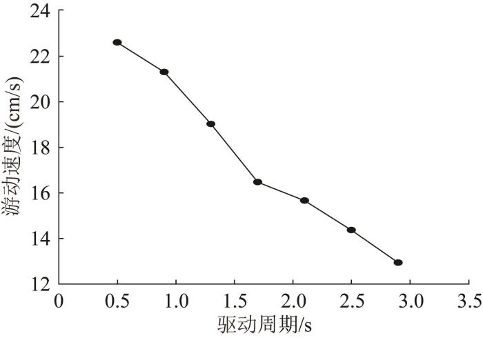 由图22可知,机器人的游动速度随驱动周期减小呈增大趋势。当驱动周期为2.8 s时,机器人样机的游动速度最小,为12.93 cm/s;当驱动周期为0.5 s时,机器人样机的游动速度达到22.5 cm/s。