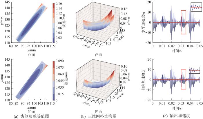 图5 (a)和图5 (b)反映了齿面在局部坐标系下的空间形貌特征。由图可知,齿面中部存在较为连续的低值带区域,齿顶及边缘位置的误差值较大,表明齿面形貌呈现明显的中部偏差平缓、边缘偏差较大的空间分布特征。该分布说明齿面中部更接近理论接触区域,易形成较为稳定的有效承载带,而边缘区域因修形或偏差量较大,在正常工况下不易优先接触,而在载荷增大或装配误差作用下可能诱发接触带偏移及与边缘接触。图5 (a)上下两图在误差幅值和边缘梯度上存在差异,表明不同齿侧或不同状态下齿面形貌特征不一致,这将进一步影响时变啮合刚度、传动误差及系统振动响应。图5 (c)给出了基于实际运行工况的振动响应计算结果。