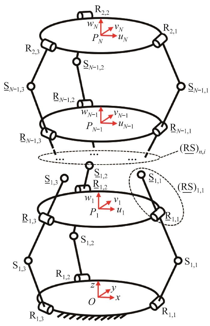 本文所研究的多体节叠加型混联机构如图1 所示。该机构是一种特殊的三支链多平台混联机构,其构型与体节数相关。当体节数不同时,机构呈现出不同的构型。以静平台(基座)→末端动平台作为体节叠加的正方向,则该机构的构型可描述为3-R1 S(RS) N -1 R2 。其中,N 为正整数,表示机构中的动平台数(即体节数)。支链R1 S(RS) N -1 R2 中各符号的含义如下:R1 表示安装在机构静平台上的转动关节,R2 表示安装在末端动平台上的转动关节,S表示与R1 相邻的球关节;(RS) N -1 表示N -1个(RS)结构首尾相接形成的支链段,R表示安装在中间平台上的转动关节,S表示安装在中间平台上的球关节,位于转动关节R之后。