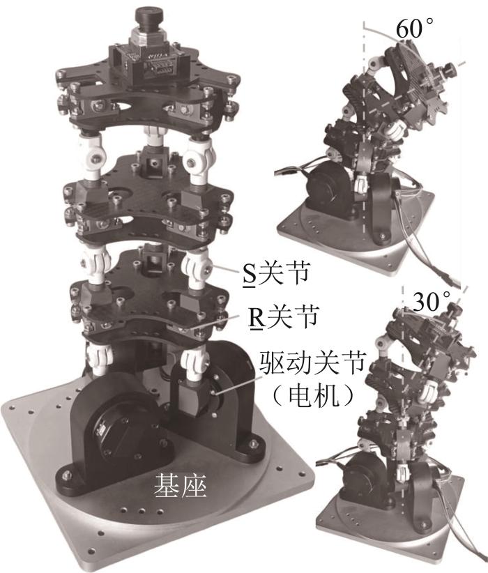 当体节数N =3时,3-R1 S(RS) N -1 R2 混联机构的实物样机如图2 所示。当以与静平台相连的R1, i 关节作为驱动关节时,该机构具有3个自由度(沿z 轴的平动自由度以及绕x 、y 轴的转动自由度)。鉴于该机构的多体节叠加特征,各体节动平台的姿态角随体节数N 的增大而逐层叠加,从而使机构的末端动平台可在x 、y 方向上实现较大的姿态角。