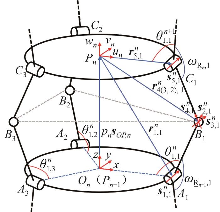 式中:s O P , n 表示由3-RSR并联机构静平台中心On 指向其动平台中心Pn 的单位方向向量;pn 表示线段On Pn 在机构由参考位形变换为当前位形过程中的长度变化量,即平移距离; r n 表示动平台中心Pn 指向参考坐标系原点的向量;s i n (i =1, 2, 3)表示动平台中心Pn 在空间内旋转的方向向量;ϕ i , n i = 1 , 2 , 3 表示第n 个动平台由参考位姿变换到当前位姿过程中绕s i n 所在轴线的转动角度,当参考坐标系的原点设在动平台中心时,ϕ i , n 为描述动平台姿态的欧拉角。