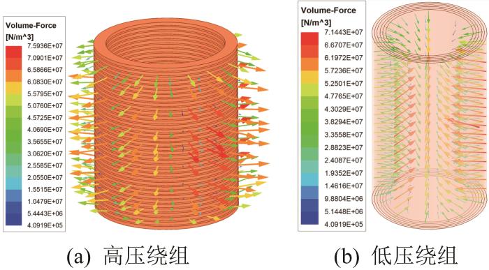 在额定运行条件下绕组单位体积短路电动力分布如图7所示。由图可知:高压绕组和低压绕组的最大瞬时值分别为7.59×10⁷ N/m³和7.14×10⁷ N/m³;电动力分布呈现明显的空间不均匀性,其径向分量对高压绕组表现为拉伸作用,对低压绕组为挤压作用,轴向分量则集中作用于绕组端部区域。