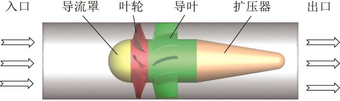 以某隧道通风系统中的轴流风机为研究对象,在建模过程中,为简化网格划分并提高计算效率,对电机结构、外壳框架等非关键部件进行合理简化。建立的轴流风机三维物理模型(包含导流罩、叶轮、导叶及扩压器)如图2所示。