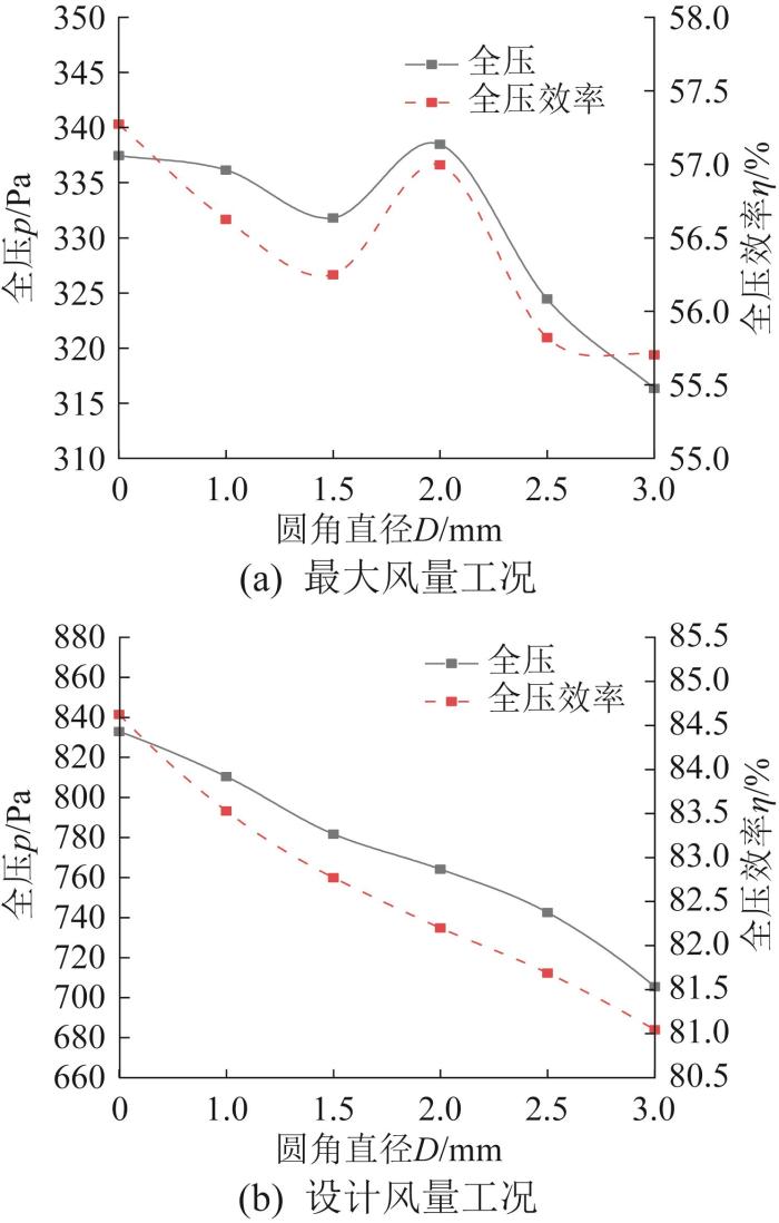 2.2 尾缘倒圆结构对风机性能的影响