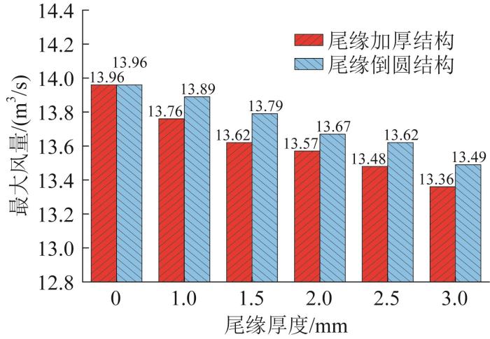 1)在采用相同叶片尾缘结构时,风机的最大风量随尾缘厚度的增大呈现降低趋势;在采用不同叶片尾缘结构时,加厚结构的厚度l每增大0.5 mm,最大风量约降低0.72%;倒圆结构的圆角直径D每增大0.5 mm,最大风量约降低0.68%。