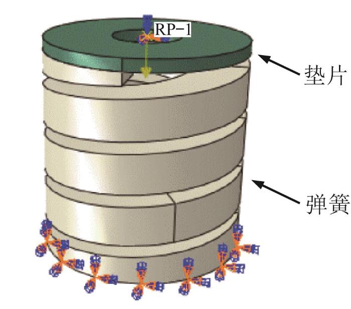 4)建立弹簧刚度数值分析模型。建立单个弹簧压缩过程的数值分析模型,如图2所示。设置弹簧的弹性模量为200 GPa,泊松比为0.3;弹簧下端固定,上端与垫片接触,限制垫片除轴向移动外的所有自由度;通过垫片对弹簧施加压力,模拟弹簧在端板装配过程中所受的来自锁紧螺母与垫片组件的预紧力。基于静力学理论开展弹簧压缩过程数值分析,获取弹簧的力—位移数据。为直观显示两者之间的关系,对数据进行可视化处理,获得弹簧的刚度曲线,如图3所示。同时,基于图4中的参考点RP-1与RP-9、RP-2与RP-10、RP-3与RP-11、RP-4与RP-12,分别建立第1至第4个弹簧的连接单元,并基于弹簧的刚度数据构建连接单元的刚度模型。弹簧连接单元在第1至第4分析步中均处于激活状态。