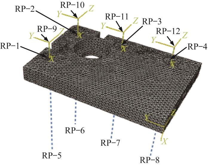 除可用于端板在装配全过程中的变形预测与拓扑优化设计外,本文所提出的高保真建模方法同样适用于弹簧、螺柱等关键紧固件的受力与变形分析。该建模方法充分考虑了装配顺序与载荷施加路径,能够在统一的模型框架下同步求解端板与紧固件的力学响应,揭示装配过程中各构件间的力—变形耦合机制。通过对弹簧与螺柱的受力历程、螺柱预紧力分布及弹簧压缩量变化进行动态模拟,可为紧固件参数优化、电堆装配工艺改进以及结构均匀性控制提供精确的量化依据。螺柱参考点(RP-5、RP-6、RP-7、RP-8)的位置见图4,这些参考点与螺柱连接单元耦合,其支反力在数值上等于对应螺柱的预紧力。通过提取