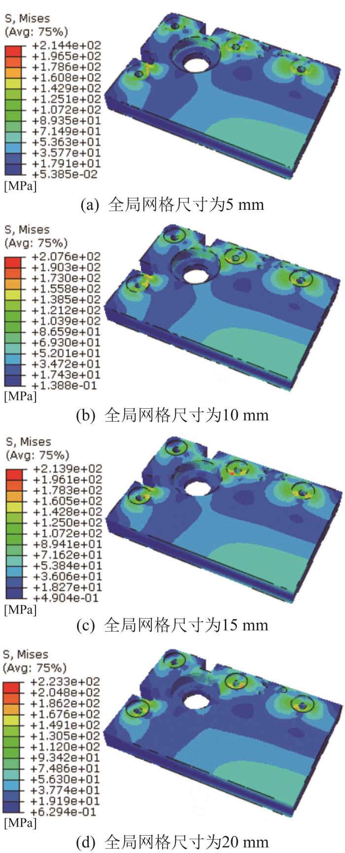 实体单元可用于应力、传热等分析,特别适用于涉及接触变形、塑性变形及大变形的复杂非线性分析。与二阶单元相比,一阶单元的刚度通常过大,且需要极其精细的网格才能获得准确结果。考虑到端板几何形状复杂以及拓扑优化模型的网格适用性,本文采用三维十节点四面体二阶单元建立端板受力变形分析的网格模型,如图4所示。设置全局网格尺寸分别为5、10、15、20 mm,最小网格尺寸均为1 mm。开展不同全局网格尺寸下的端板受力变形数值模拟分析,从计算时间、最大Mises应力、变形量三个层面分析全局网格尺寸对数值模拟结果的影响。