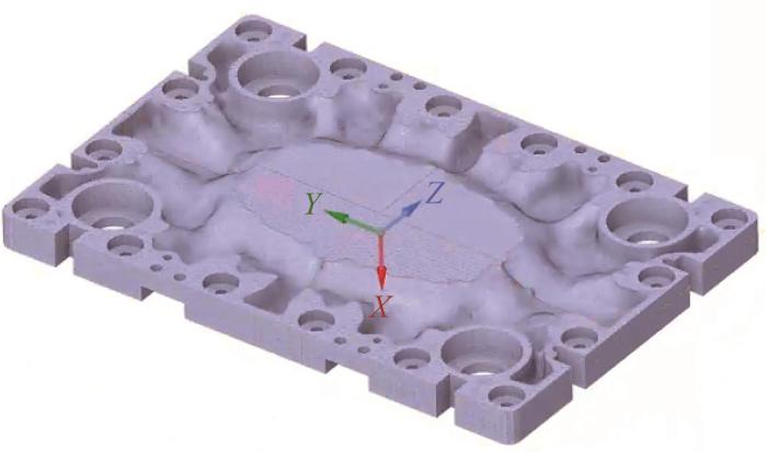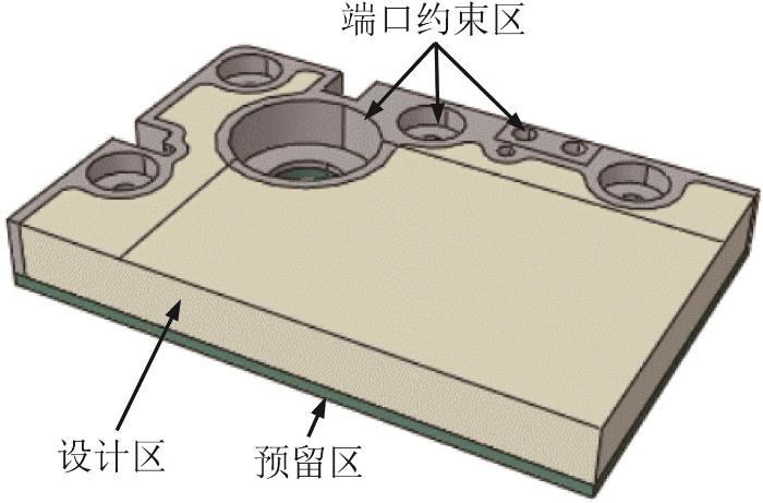 依据上文端板受力变形预测模型的建模流程,构建预优化构型端板的受力变形预测模型,并在此基础上建立拓扑优化模型。优化目标设为最小化图7所示设计区的材料体积分数,以实现端板结构的轻量化设计。在装配位移约束方面,限定载荷施加区边界的最大位移不超过2.569 mm,以确保优化构型端板的结构刚度不低于初始构型端板。在制造工艺约束方面,将设计区的脱模角设为5°,脱模方向为沿端板厚度方向向上,以满足模具加工与零件脱模的可行性要求。同时,设置最小构件的尺寸为20 mm,以避免拓扑优化后出现细长且难以制造的结构特征。对于端口约束区及预留区等非设计区,在拓扑优化过程中保持几何形态不变,以确保关键功能端口及装配面的完整性。上述建模条件与约束条件的综合设定,可使拓扑优化过程既能充分发挥设计空间潜力,又能兼顾结构性能、制造工艺性及装配适配性,为端板的轻量化设计提供了严谨且可实施的技术路径。
