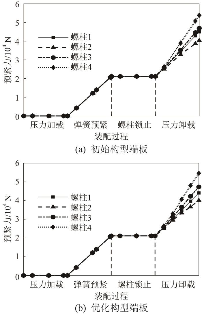 单独分析图11(a)、图11(b)发现:在压力加载阶段,螺柱连接单元全部处于抑制状态,因未与端板建立机械连接,故螺柱预紧力为0 N。在弹簧预紧阶段,螺柱预紧连接单元和弹簧连接单元被激活,与端板建立了机械连接,使得施加在弹簧承载面上的辅缸压力及螺柱初始预紧力开始传递,此阶段的螺柱预紧力随着预紧过程的推进呈现递增趋势,且弹簧预紧阶段结束时4根螺柱的预紧力均等于预设的21 150 N。在螺柱锁止阶段,螺柱锁止连接单元被激活,因未更改外部载荷与边界条件,本阶段的螺柱预紧力保持不变。在压力卸载阶段,通过解除位移限制区的约束以模拟压力机卸载过程,基于静力平衡条件开展端板的受力变形自协调计算,此阶段的螺柱预紧力随着压力卸载过程的推进呈现增大趋势。