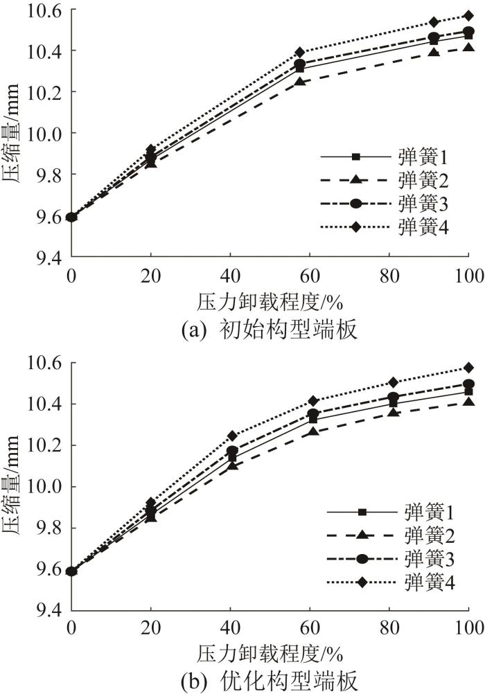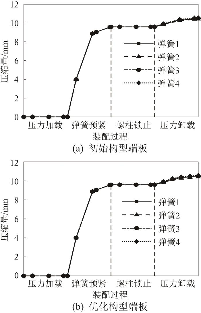 基于所提取的数值模拟数据,计算压力卸载后的弹簧压缩量及其变化率,结果如表5所示。结果显示:在初始构型端板中,弹簧压缩量的最大变化量为0.16 mm,对应的变化率为1.54%;在优化构型端板中,弹簧压缩量的最大变化量及对应变化率分别为0.17 mm和1.63%。横向对比表明,在相同端板构型下,不同位置弹簧之间的压缩量差异极小,且其变化幅度在统计意义上不显著,说明端板构型对弹簧压缩变形行为的空间均匀性的影响有限。纵向对比表明,对于安装在同一位置的弹簧,2种构型之间压缩量的最大差异仅为0.01 mm,表明优化构型对弹簧压缩量分布特性的影响可忽略不计。综上,端板拓扑优化在实现显著减重的同时并未对弹簧的受力与变形一致性产生不利影响,从而确保了装配过程的力学协调性与结构稳定性。