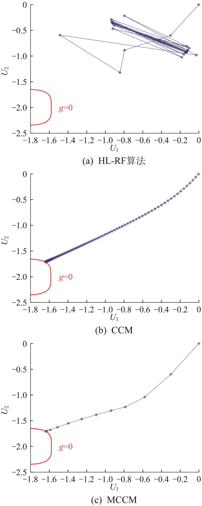 图3 所示为不同概率可靠性求解方法的迭代过程。在该算例中,极限状态函数g X = X 1 4 + 2 X 2 4 - 20 ,其中变量X 1 和X 2 均服从正态分布N (10, 5)。图中:U 1 和U 2 分别表示X 1 和X 2 在标准正态分布空间中的取值。图3 结果表明:HL-RF算法无法获取结构失效概率,而CCM可有效避免概率可靠性求解过程中的不收敛问题;采用MCCM求解时,仅需少量迭代即可获取结构的失效概率,可在解决收敛问题的同时大幅提高概率可靠性的求解效率。